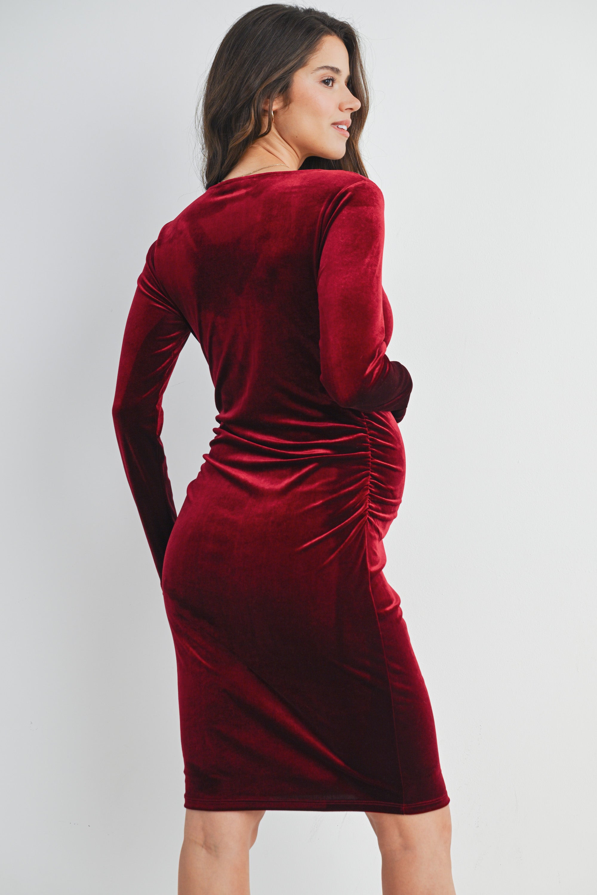 Velvet Side Ruched Long Sleeve Maternity Dress