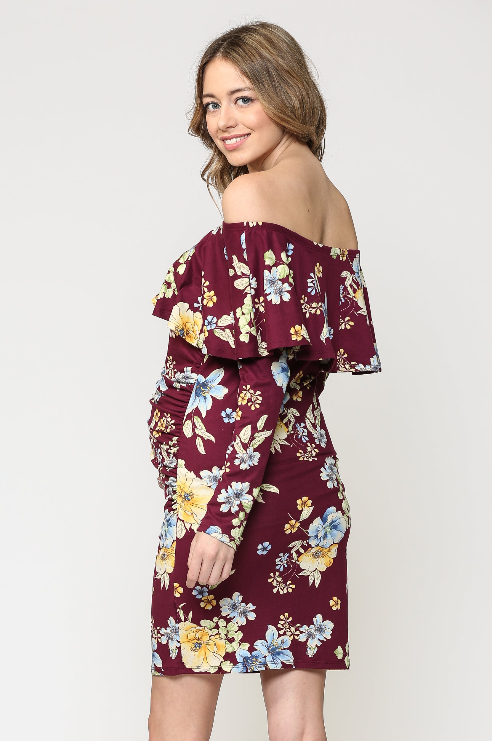 Floral Off The Shoulder Ruffle Maternity Dress With Ruched Sides