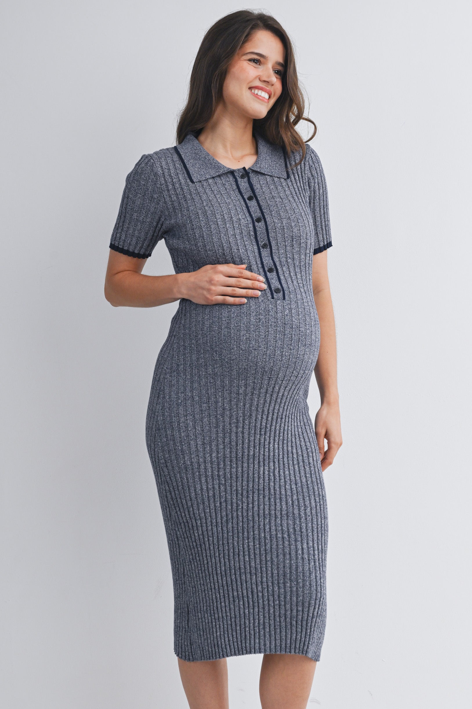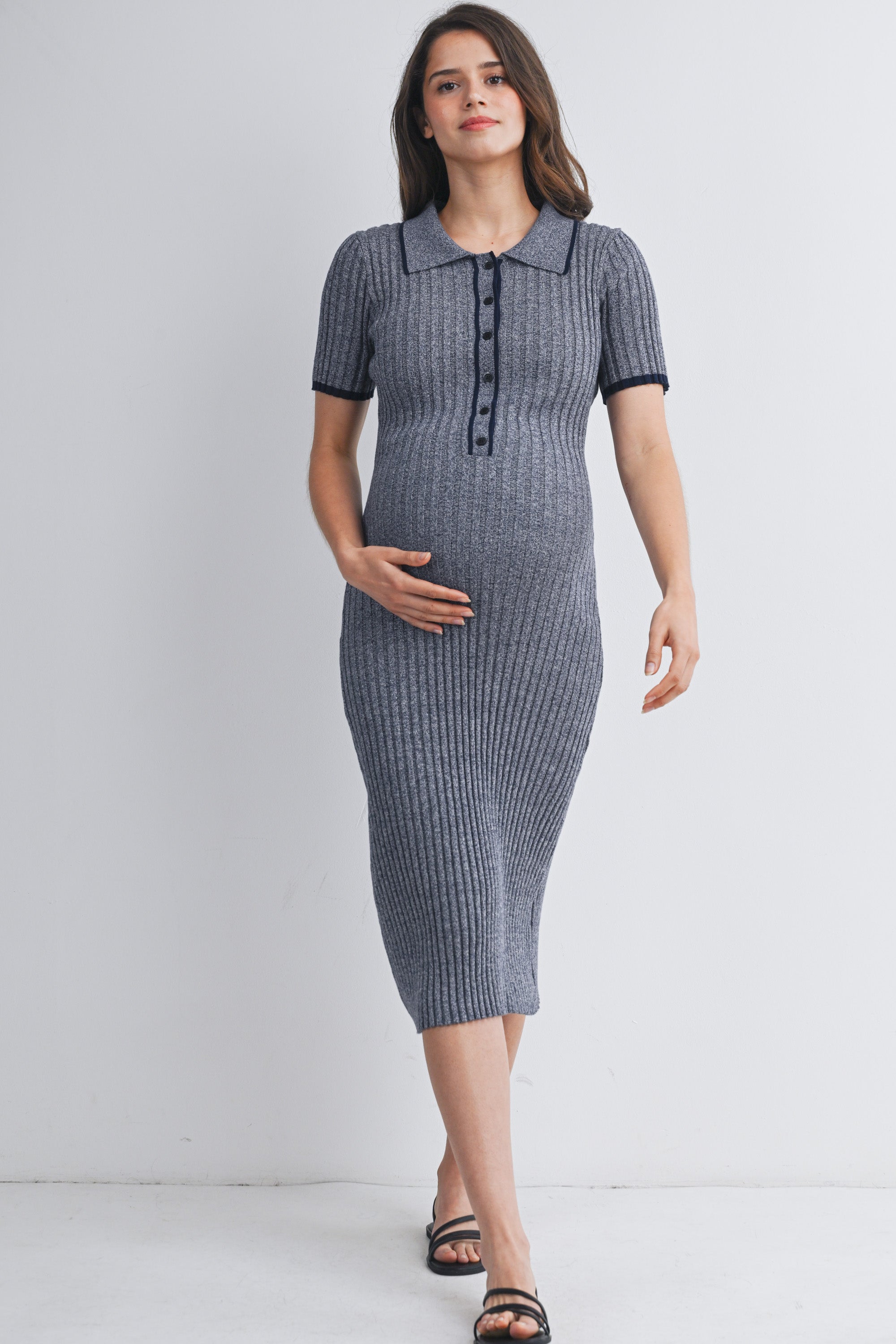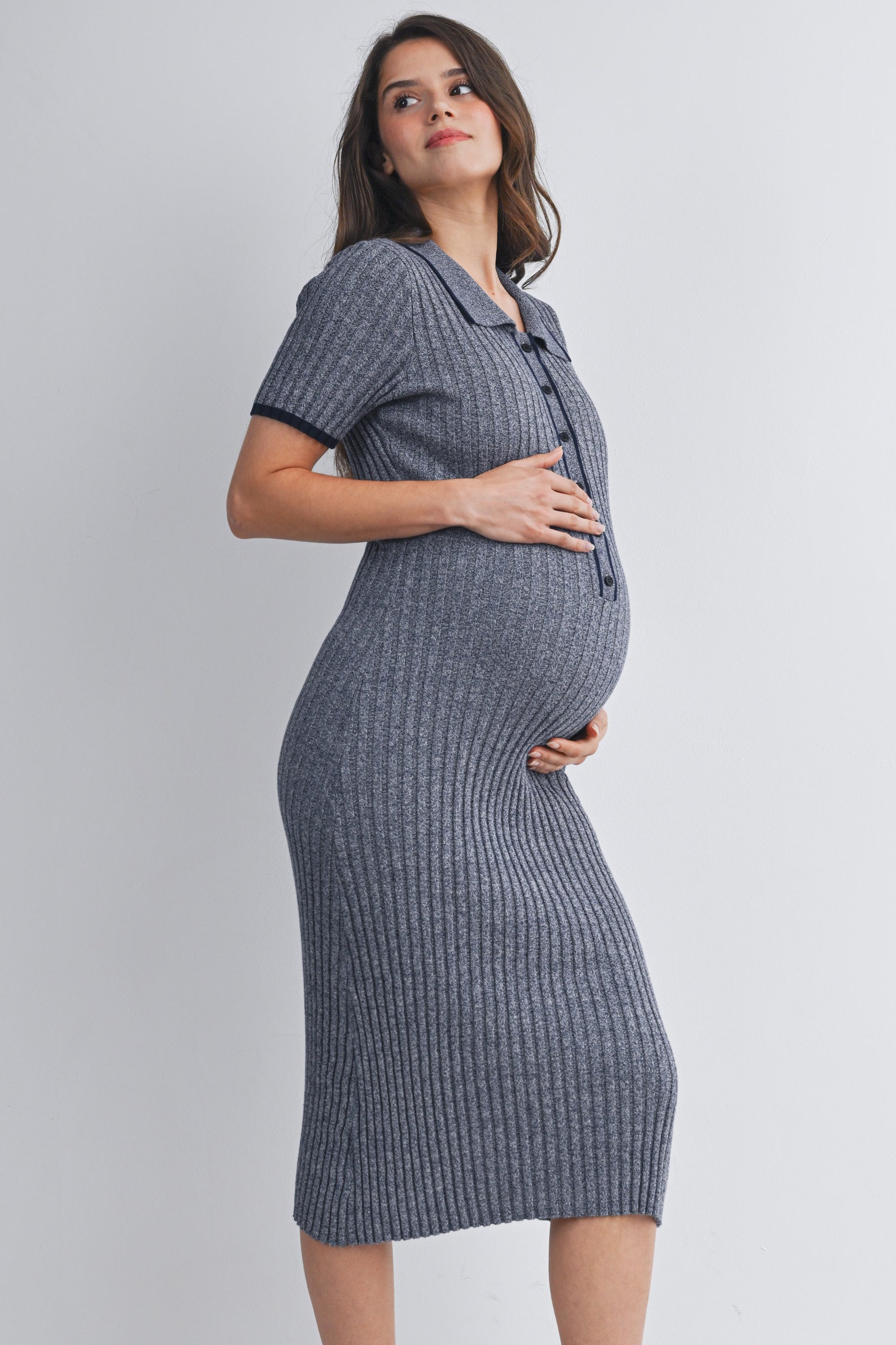 Collared Ribbed Button Front Short Sleeve Maternity Midi Dress Nursing Friendly