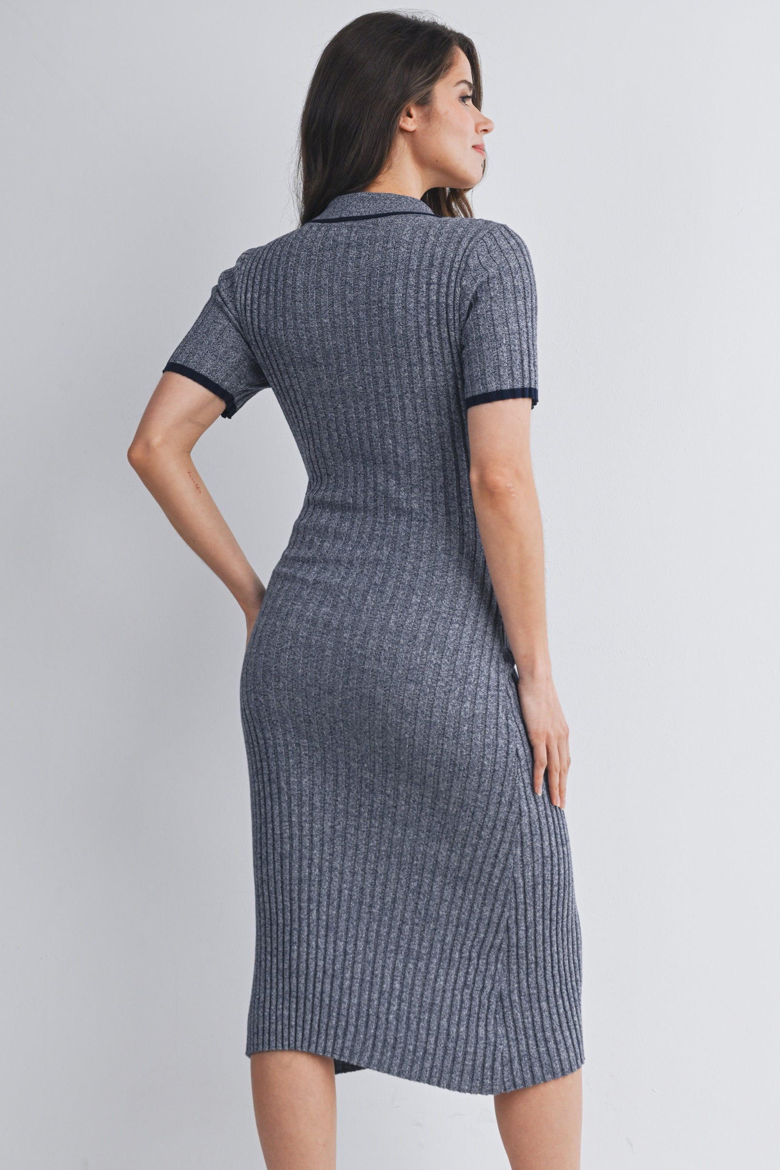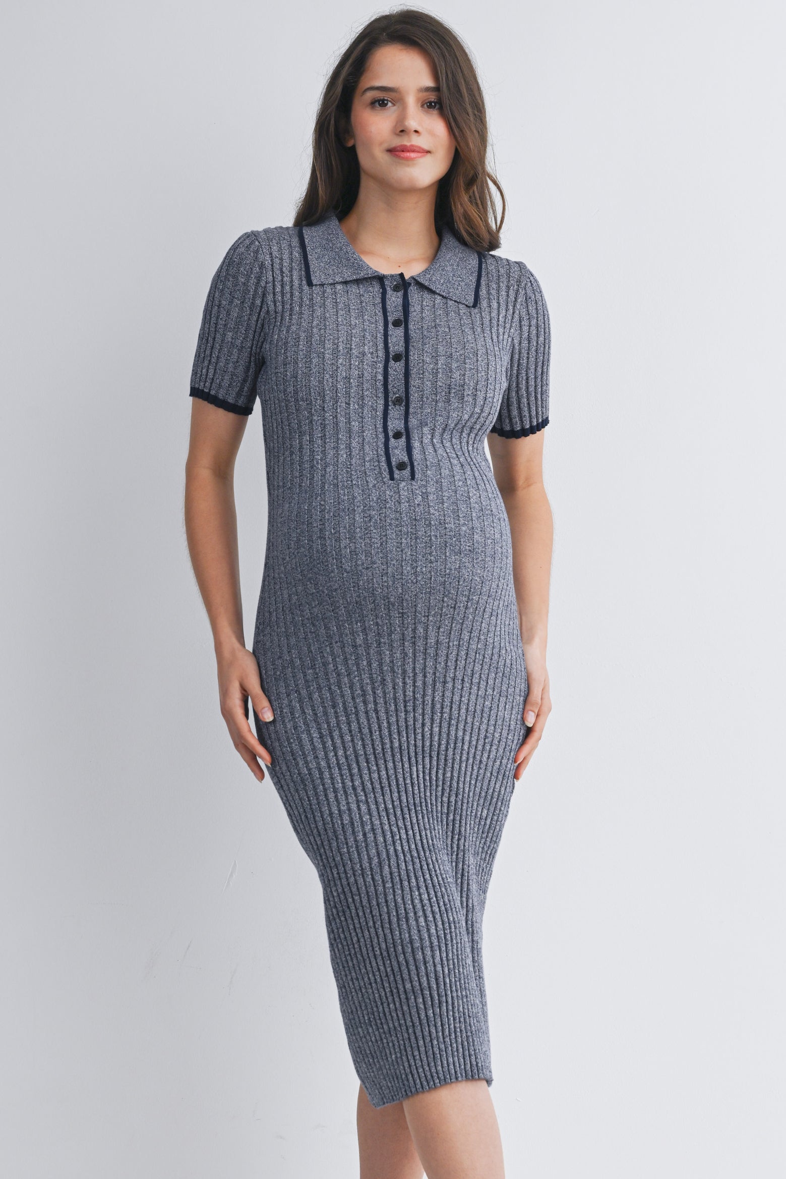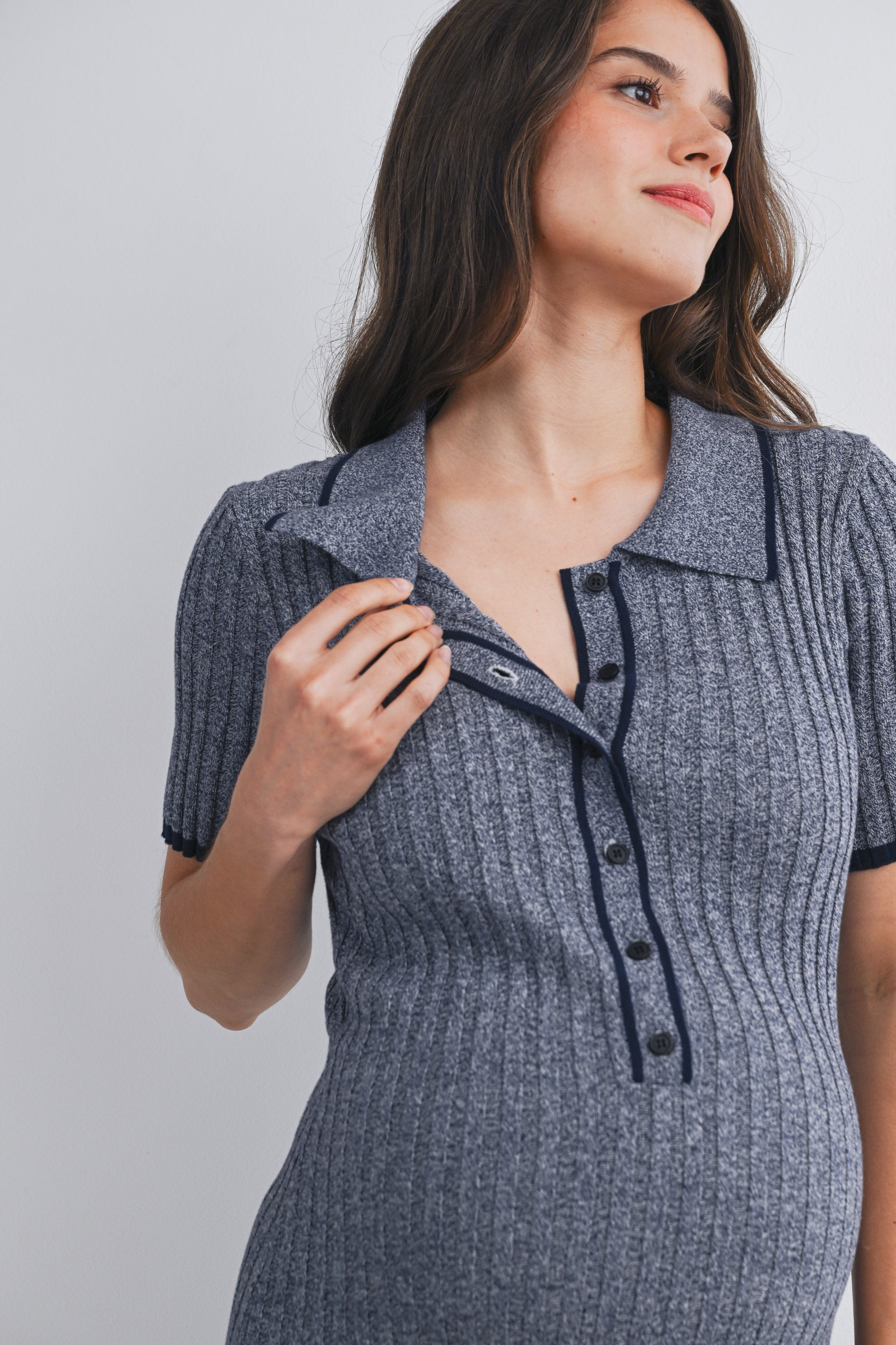 Collared Ribbed Button Front Short Sleeve Maternity Midi Dress Nursing Friendly