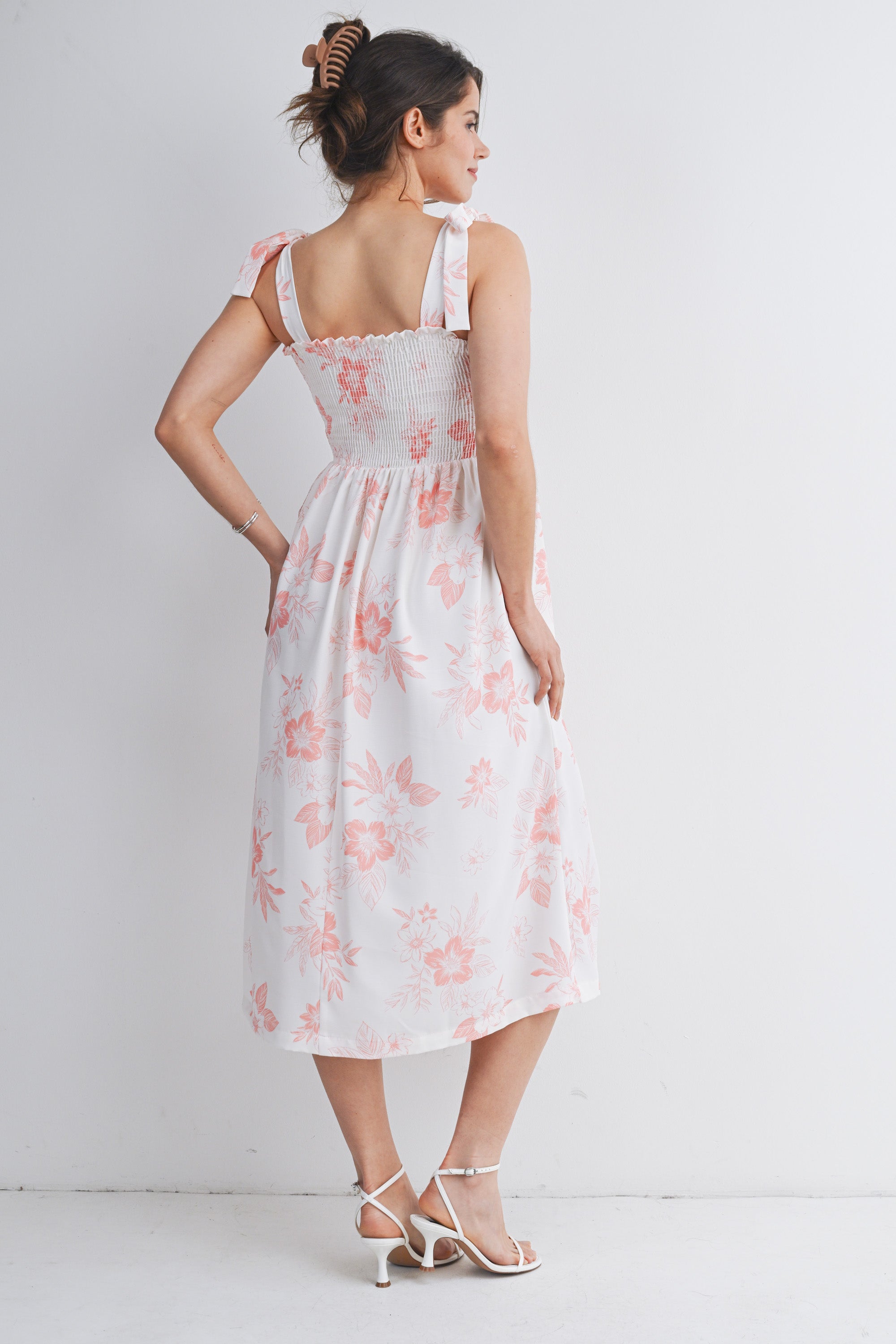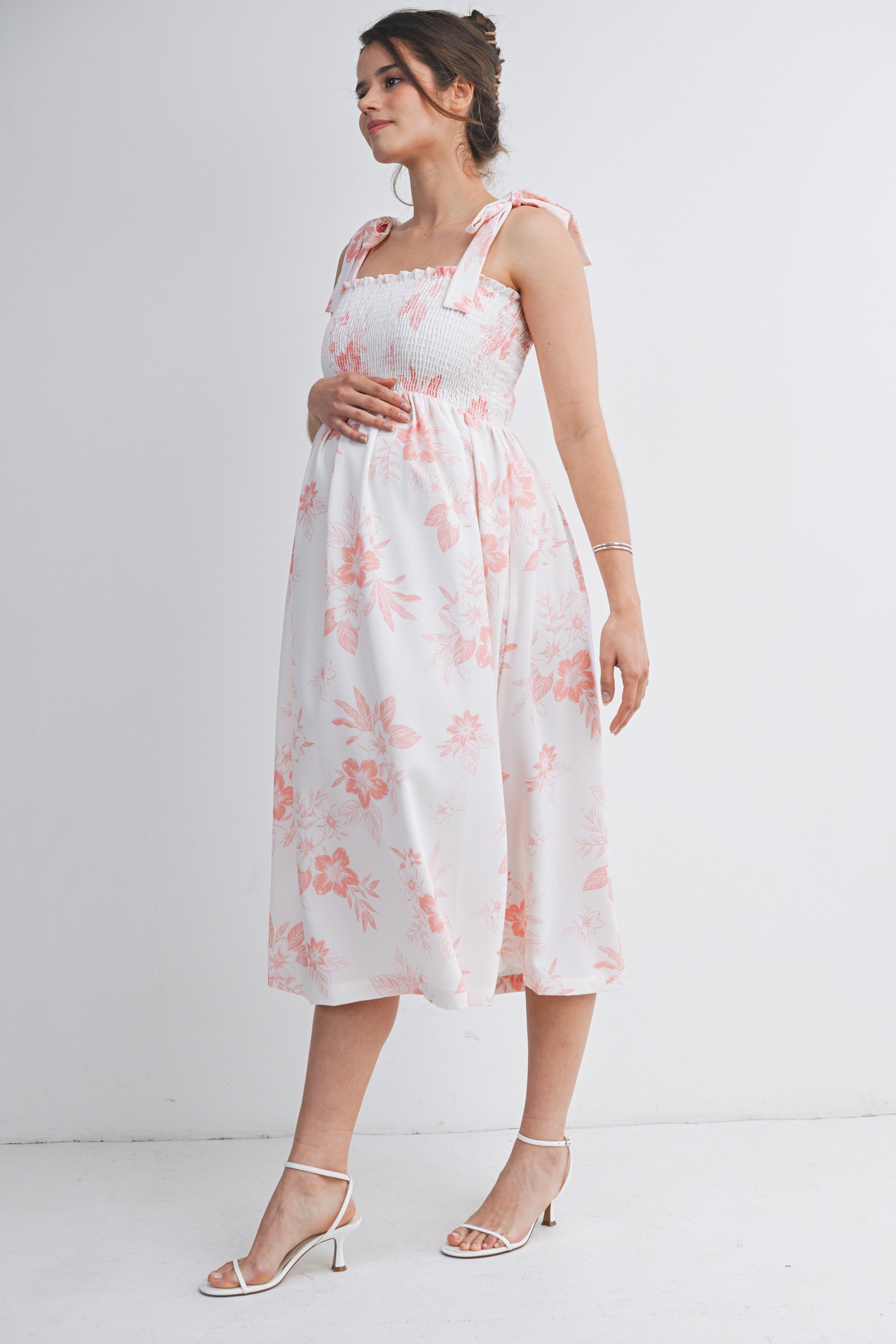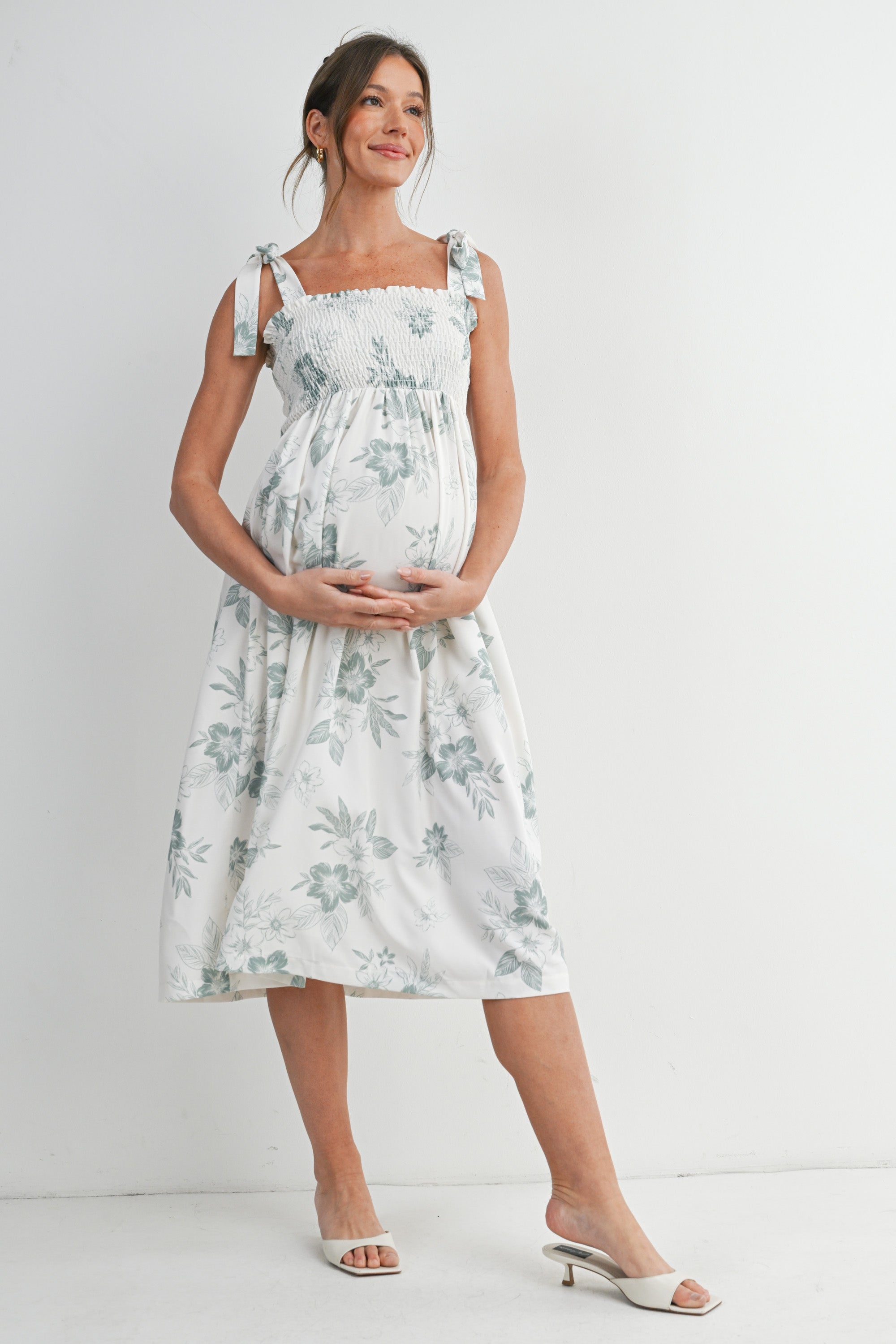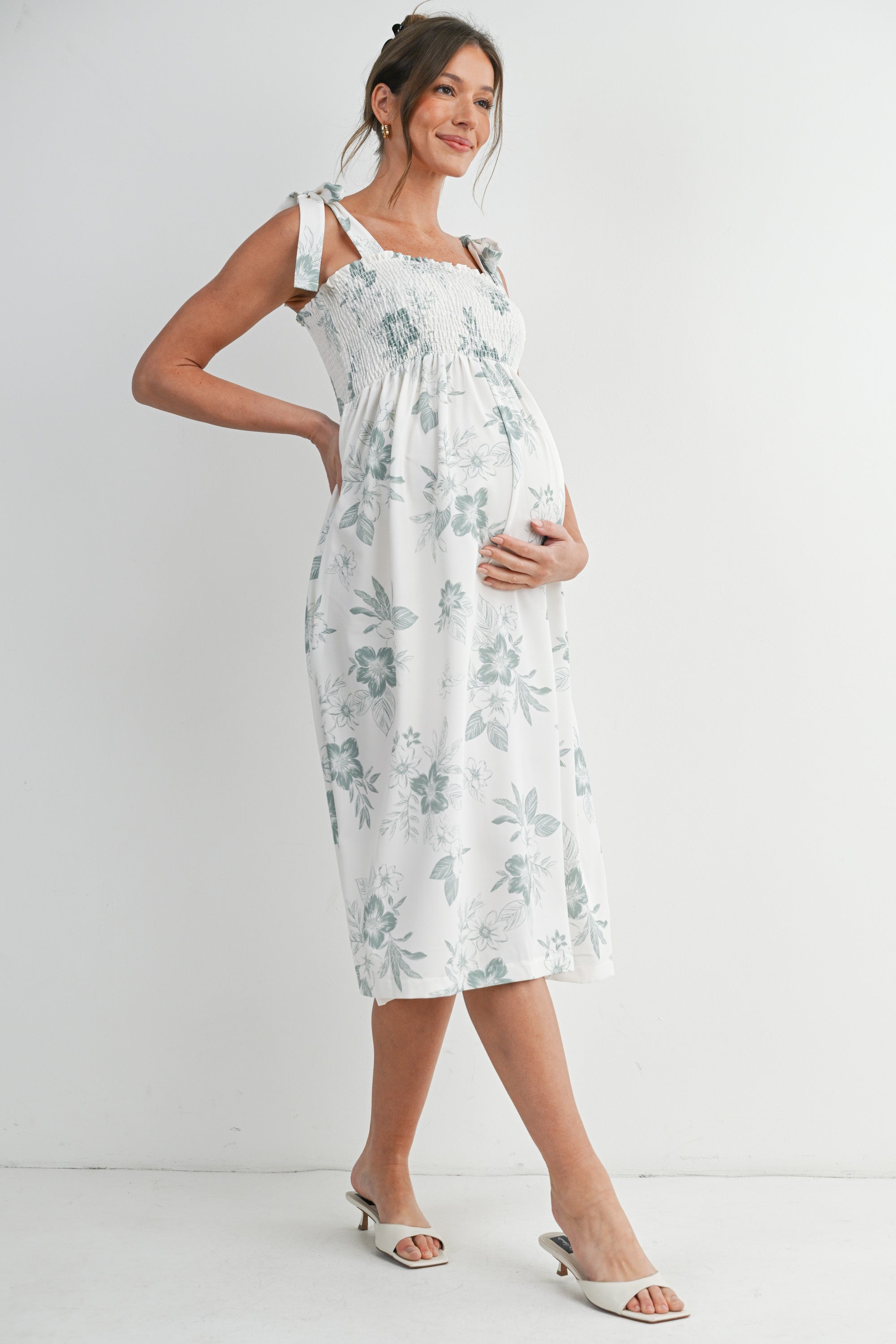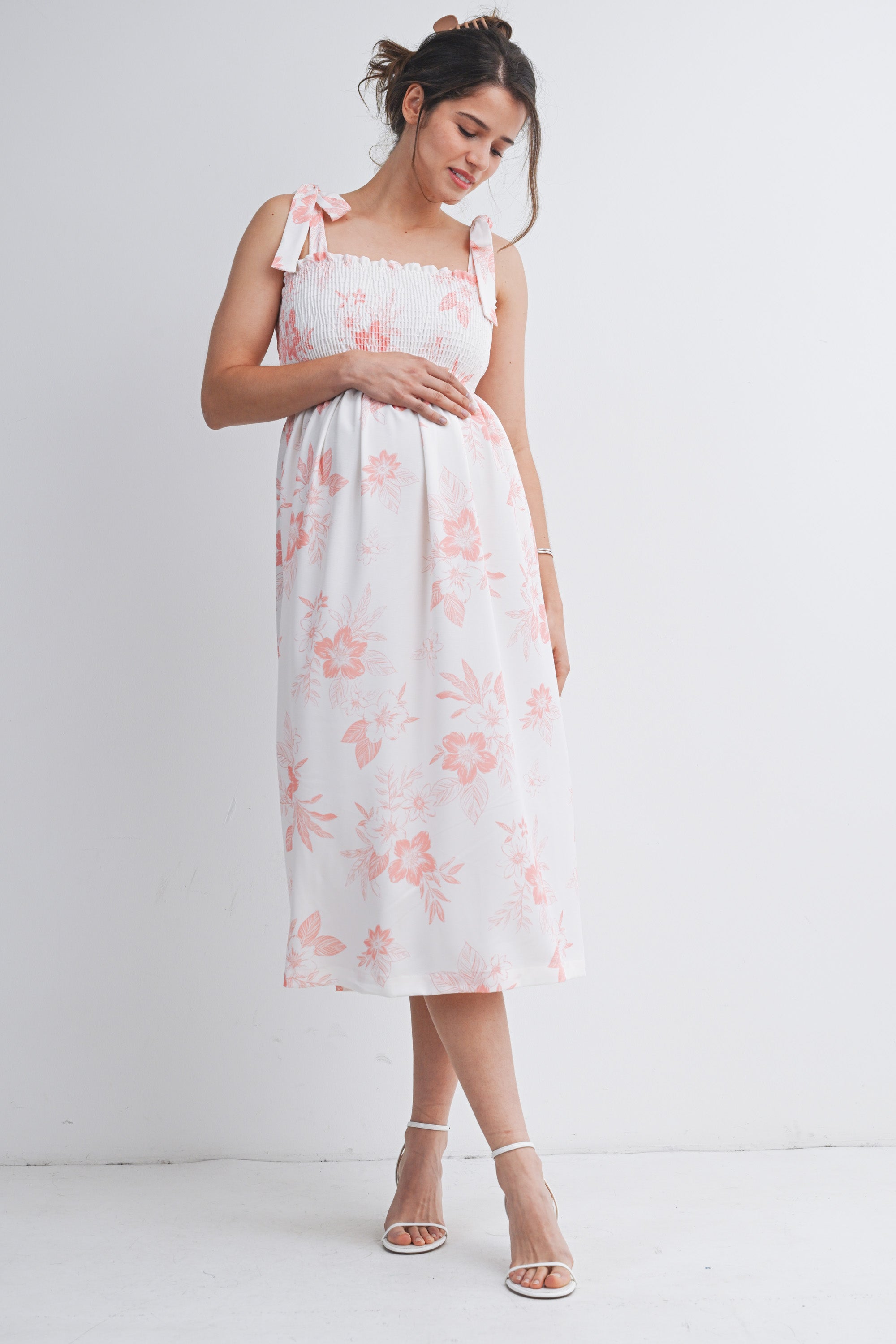 Floral Smocked Empire Waist Tie Straps Maternity Midi Dress