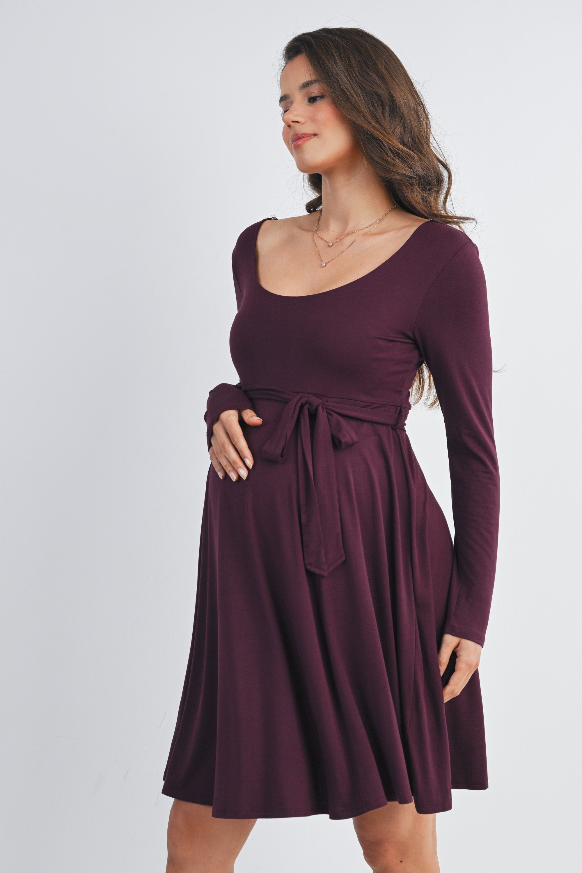 Scoop Neck Long Sleeve Maternity Dress with Waist Belt
